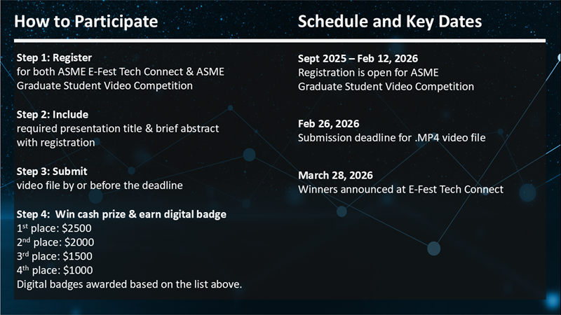 The ASME Graduate Student Video Competition will ONLY be held VIRTUALLY and at E-Fest Tech Connect, March 28, 2026.